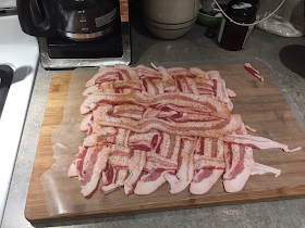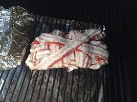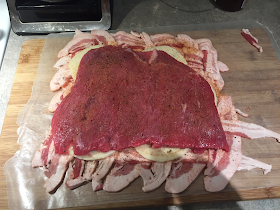 I used 2 lb of bacon. Pepper jack cheese, flank steak pounded out and pork boudin sausage. Smoked till internal of 200 degrees. Cut and drizzle with steins. Really good. I think next time I'll do chicken, more cheese (sharp cheddar) and add a few jalapeƱos. May omit the boudin. It was good but a huge pain to keep in the thing during roll up. My daughter took one bite and as she chewed just stared at me and said wow this is good. Served with a salad and black eye peas. Good stuff thanks for sharing. Feel free to post this if you want to.