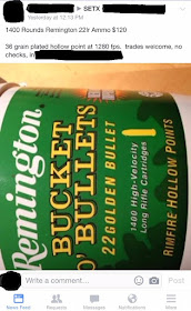 You see, someone thought it'd be a "cool" idea to start a local group, invite all of their ammo gouging reach around buddies to be admins in it, and then proceed to full on support each other in their gouging adventures on the internet. Anytime someone calls them out on their activities, they become hostile, start talking shit, and ultimately block or ban you from the group so that you don't fuck up their gouging market for any other sucker that's dumb enough to pay those kinds of prices because they don't know any better. Let's just say it's a select crowd of gun snobs and they ain't really my cup o' tea.